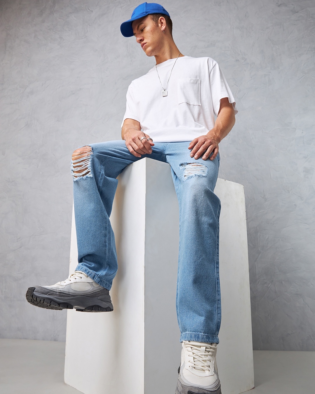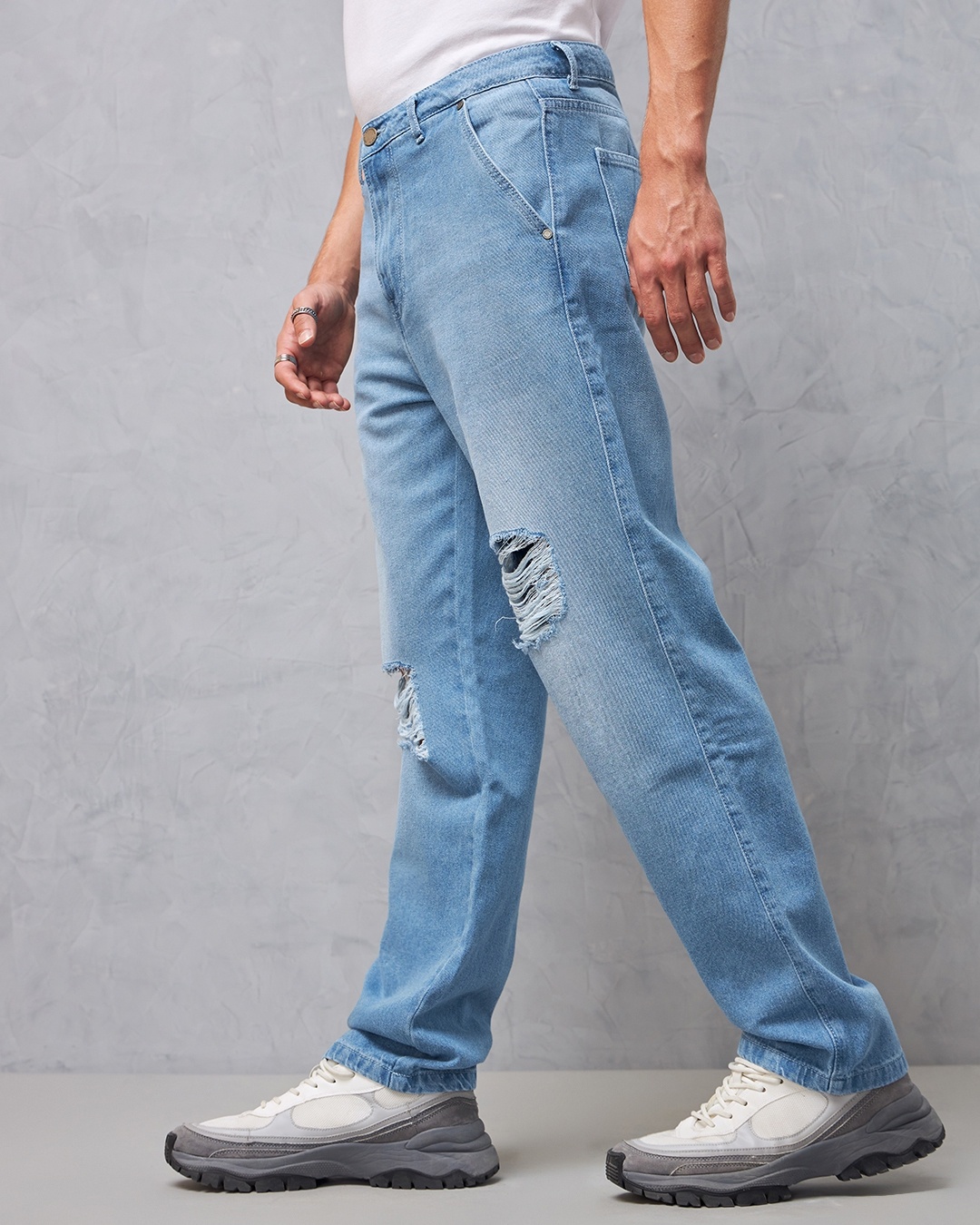 Add an urban edge to your look with our Men’s Blue Washed Baggy Distressed Jeans! Pair them with a graphic tshirt and sneakers that offer a modern twist on classic denim.